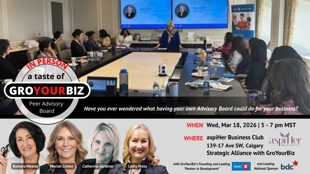 Sign up for this free session to meet Calgary Chair, Catherine Gardiner and LEARN about the benefits of what a peer-to-peer virtual advisory board can do for you. By joining a GroYourBiz board not only will you benefit from the monthly expert feedback of experienced women business owners, you’ll learn how to leverage what’s in front of you as you develop your business.